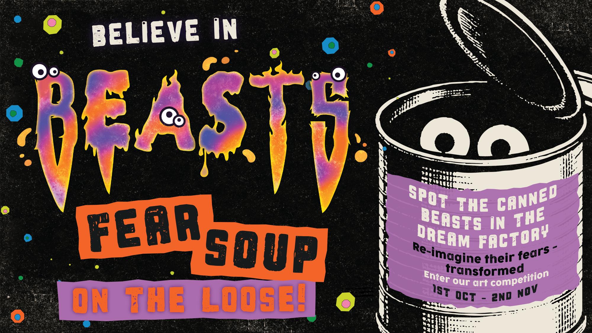 From 1st October to 2nd November, cans of Fear Soup escape during the spookiest time of year. Their lids crack open, eyes peering out… each beast trapped inside by the fear it holds. Visitors are challenged to uncover six mysterious canned beasts hidden throughout the Dream Factory.